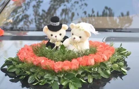 婚车装饰中重要的可以说是车头的装饰,一般这个位置不会使用鲜花,因为鲜花太软容易因为车开动后的气流变形或者被打散,所以好采用玩偶或者硬质的蝴蝶结装饰,这样既可以起到好的装饰作用,而且稳定性也好,不容易变形或者脱落。