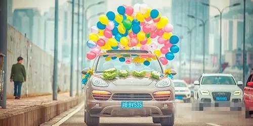 注意:气球线不宜太长,在驾驶中很容易相互缠绕,随风刮到新人。好的办法固定在车牌上,色系可以根据汽车颜色而定。